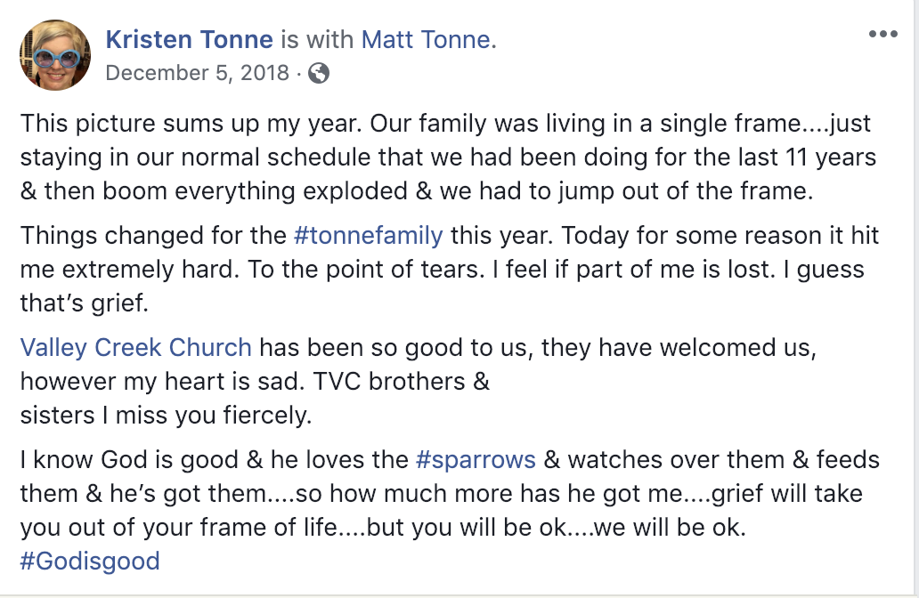 Tonne was out at TVC in June 2018. MC partially informs congregation in 9/2018 stating Alleged Perp was not part of congregation. 1/19 learn he was indicted and was kid min. Was that 6/18 departure really just abt alcohol or had an abuse report been made by then?— Jane Speaks (@JaneSpeaksUp) January 27, 2019